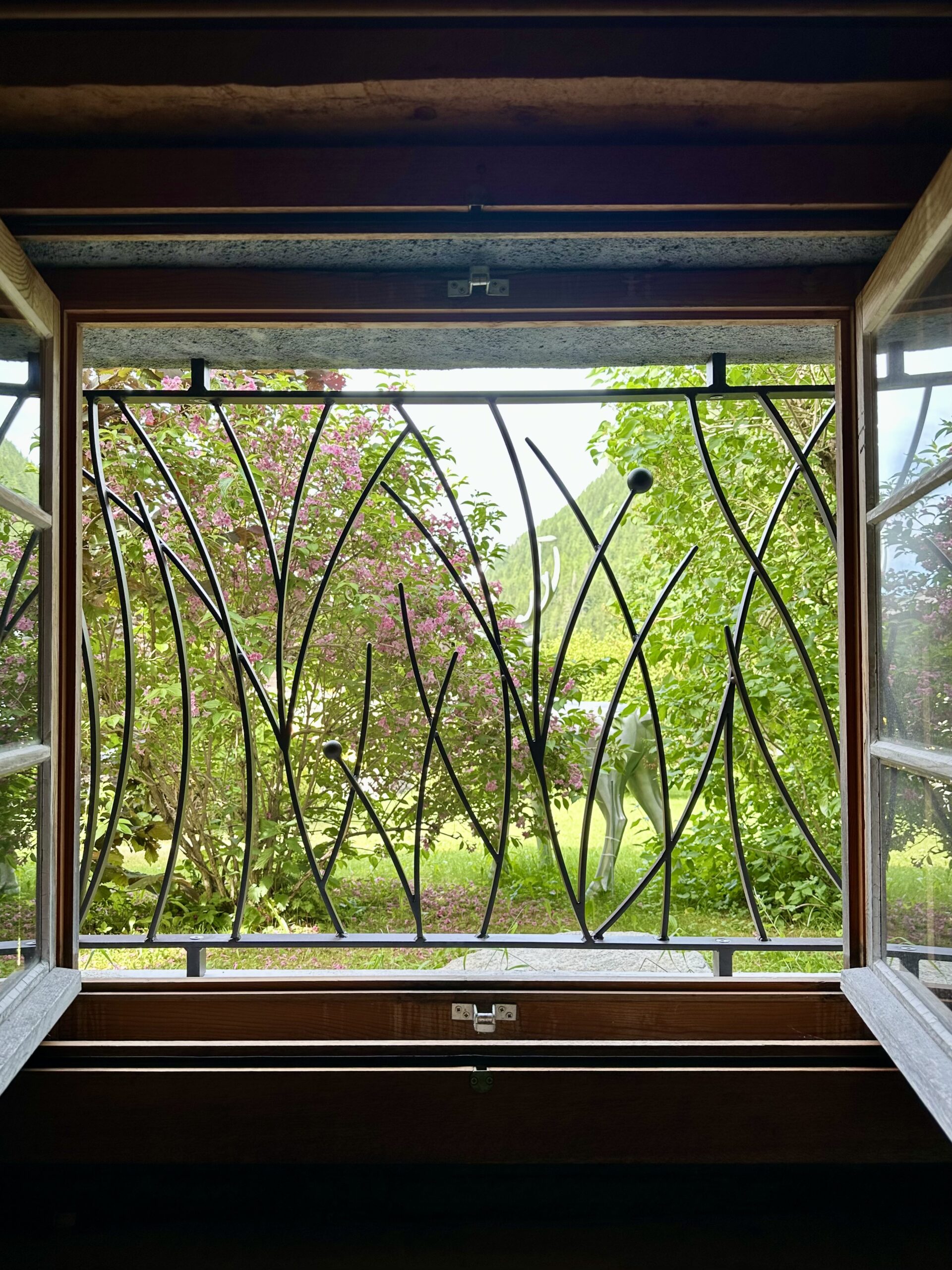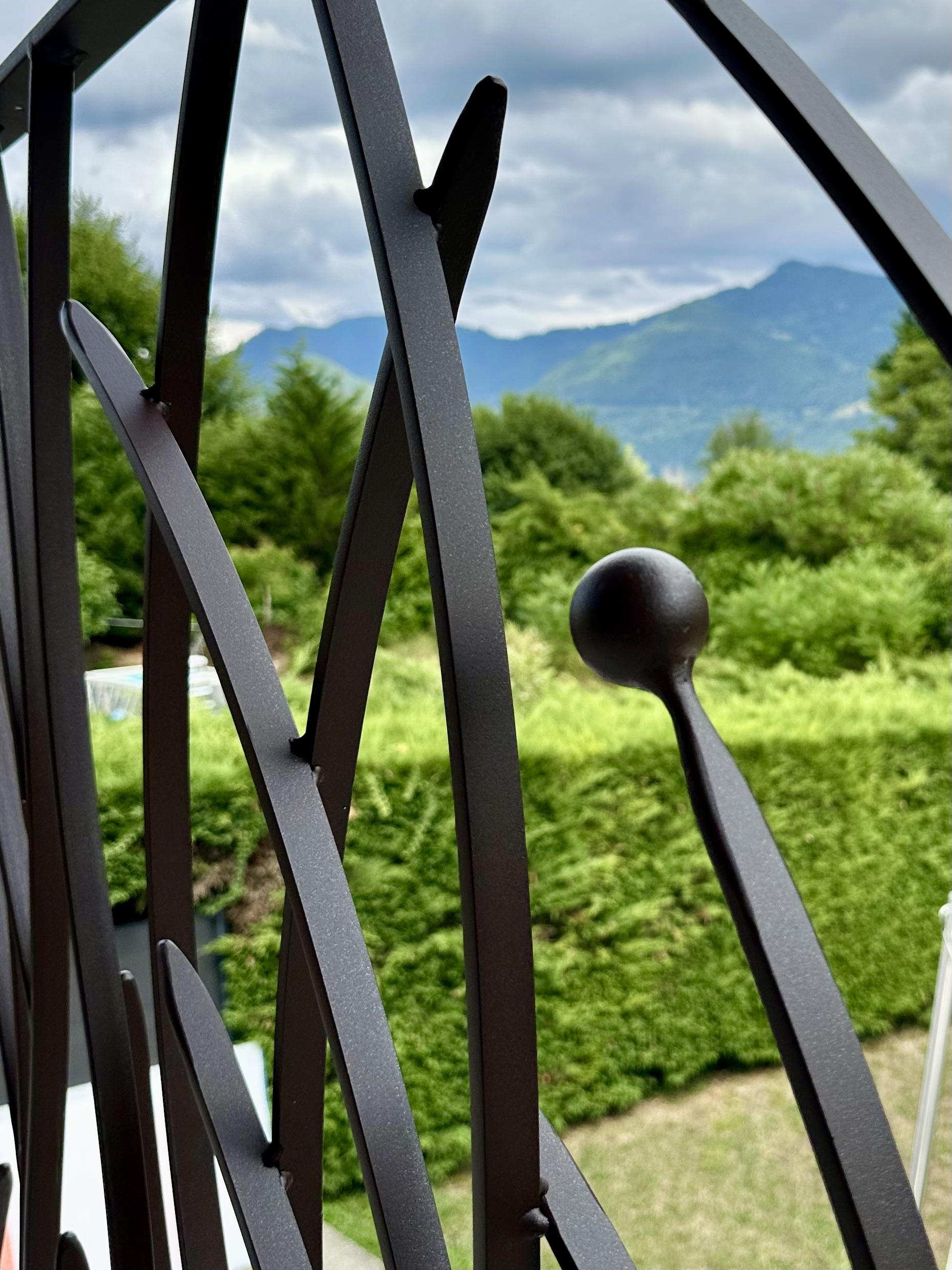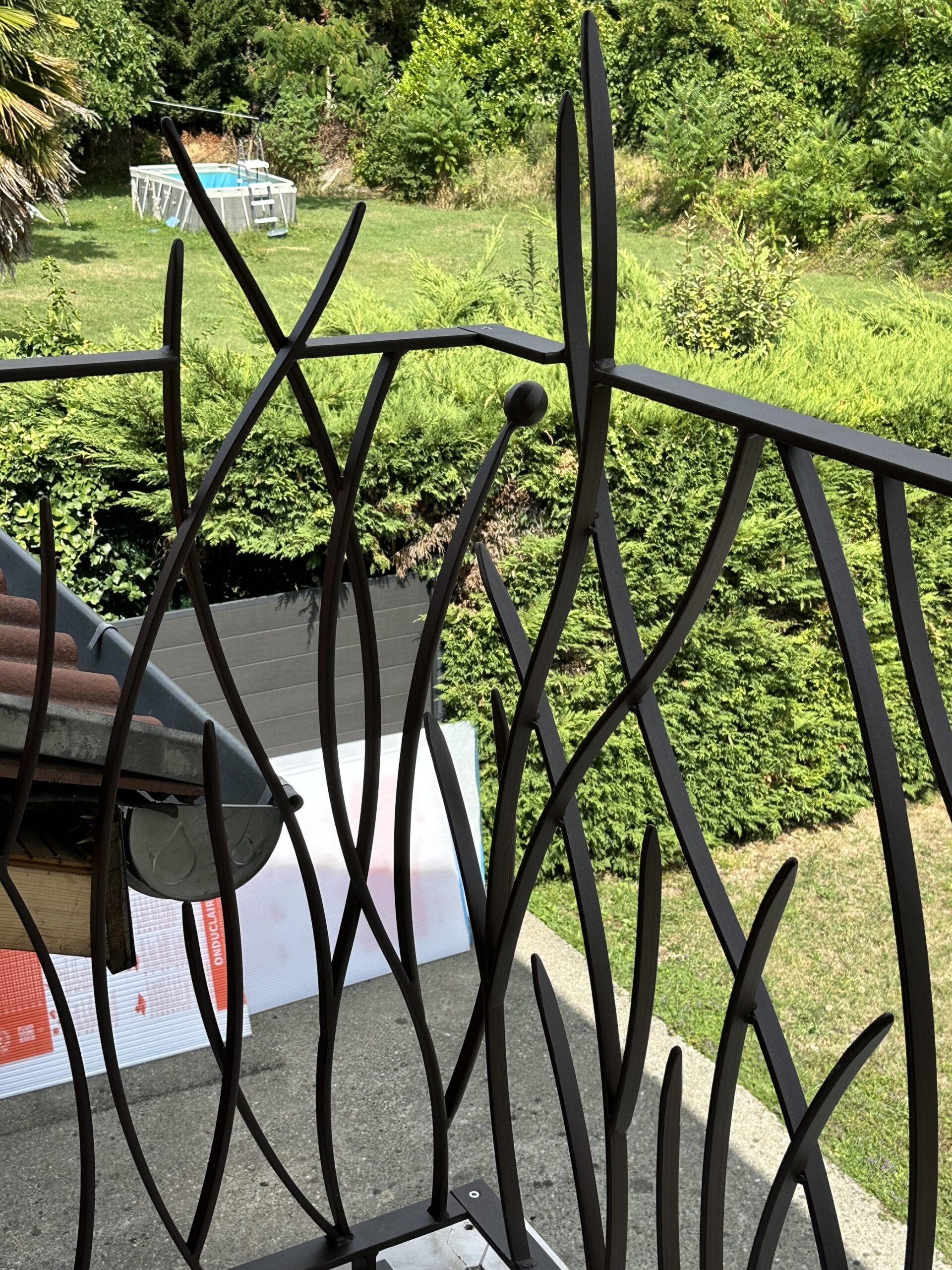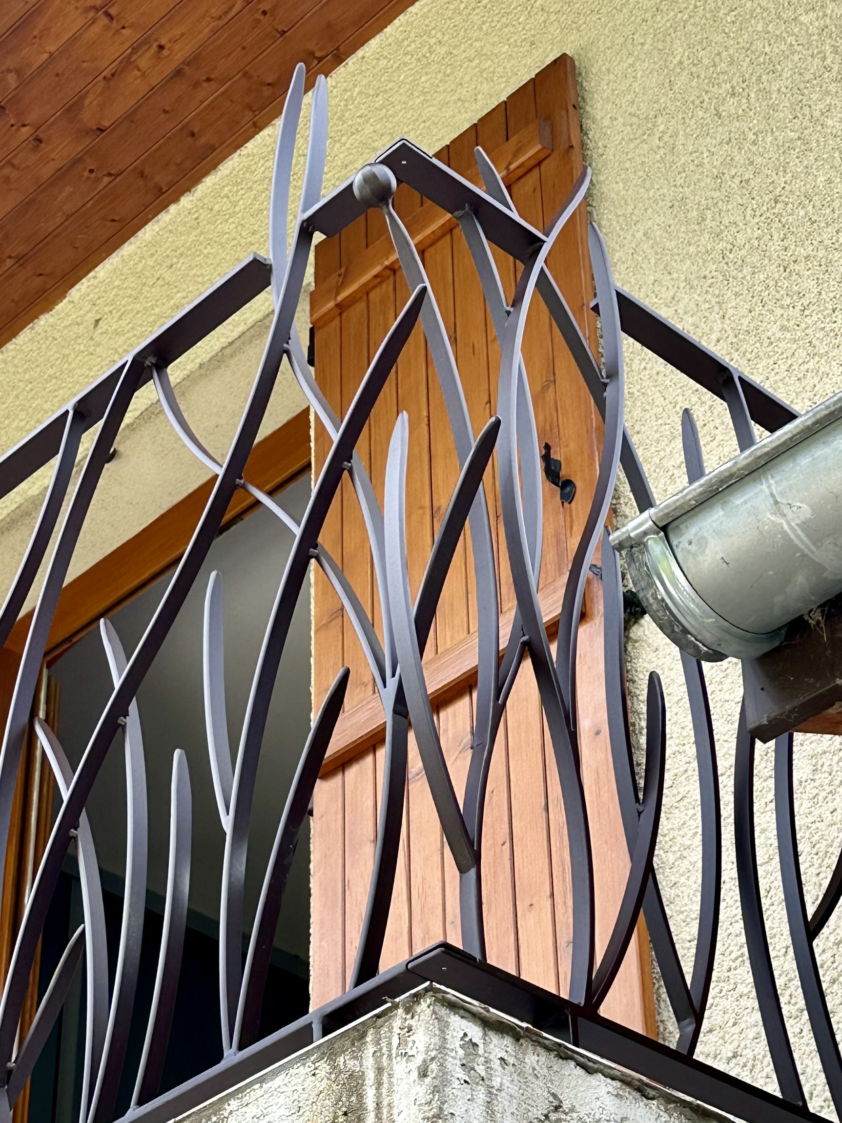 Tout en courbes et en sections de fers plats cintrés, l’idée est d’avoir un rendu esthétique délicat, avec des ornements en boules subtilement dosés, sans répétition du motif pour que chaque mètre linéaire soit unique.
